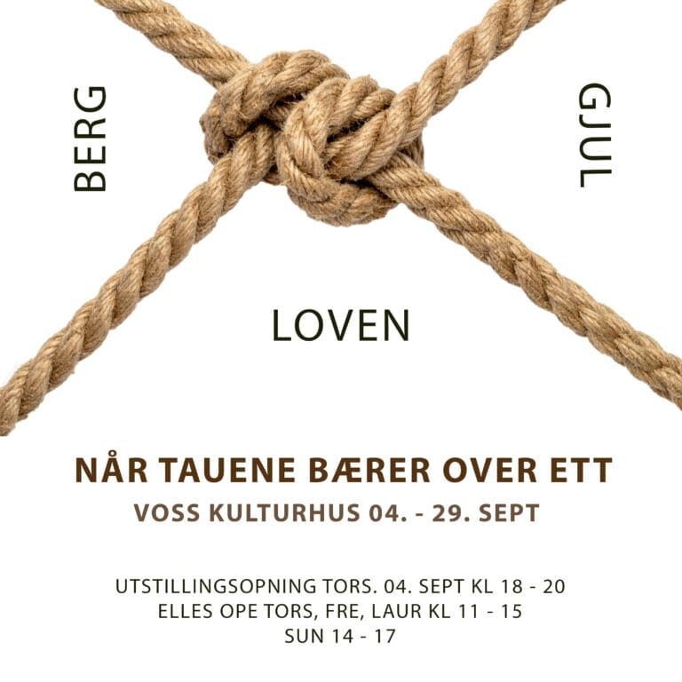 Hjarteleg velkomne til utstillinga «når tauene bærer over ett» av kunstnarane Trude Berg, Åshild Haugsbø, Morten W. Gjul og Ingeborg Loven Norekval. Opning av utstillinga torsdag 4. september kl. 18 – 20 Stad: Voss kulturhus, utstillingsrommetMusikalsk innslag av Bjørnar Ekse Brekkhus. ForfreiskningarGratis inngang Utstillinga er i samarbeid med Voss kulturhus og norske kunstforeninger. Om utstillinga:…